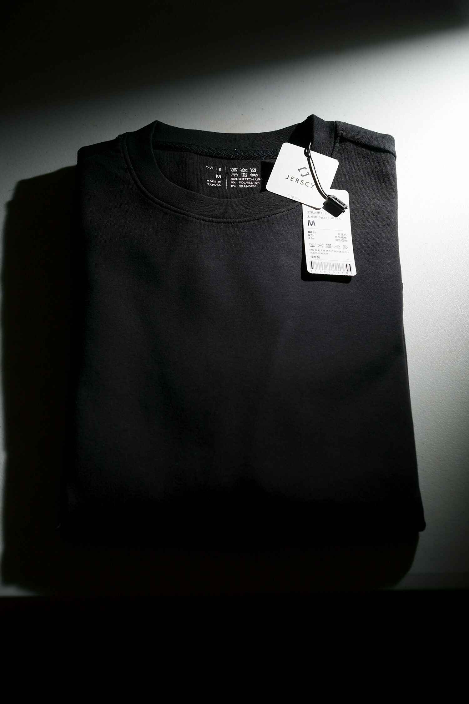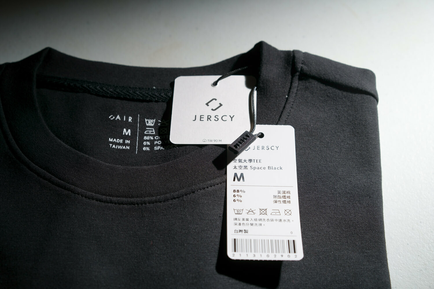 JERSCY大學TEE打開包裝後的模樣,有很精緻的吊牌,衣服是台灣製的,我這次收到的「太空黑」,除此之外還有另外兩個顏色可以選擇-「宇宙藍」與「夜幕綠」,也都挺好看的,有興趣的朋友可以到JERSCY官網看看。