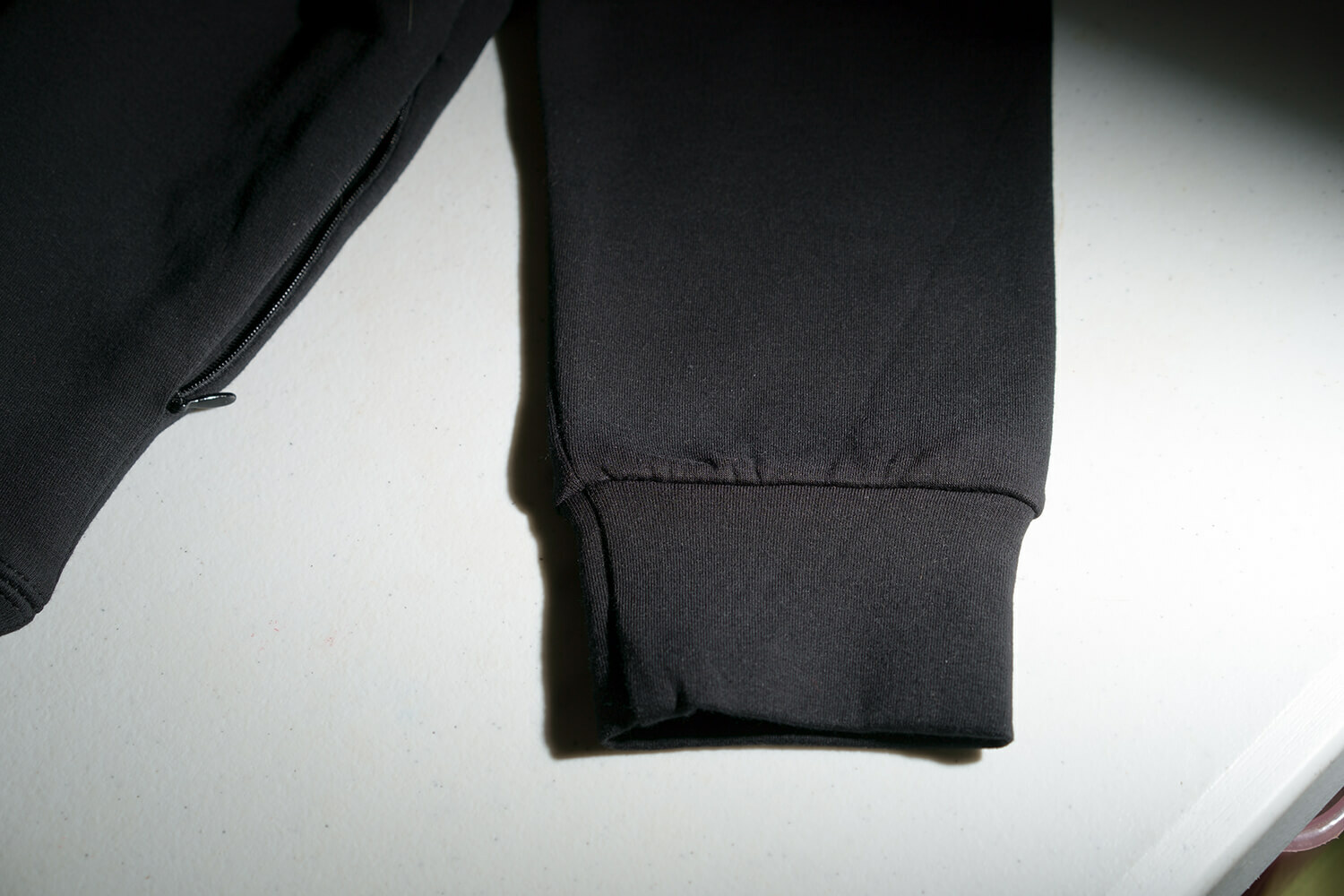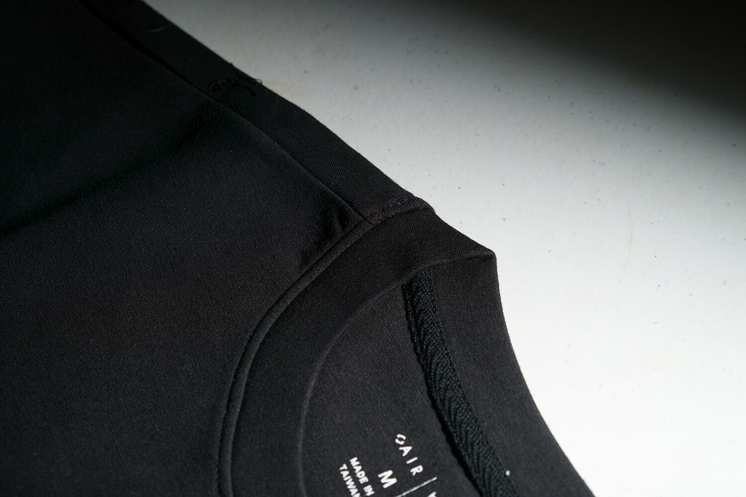 接下來帶大家看看衣服上的細節,後領標是用印的,不會有異物跟摩擦感,所謂的空氣感,是用三層織物組合而成,內外兩層是由美國棉布料包覆,中間是紗線層達到空氣層的效果,非常特別,具有厚實、保暖的特性,但整件衣服又不會太沈重,拿起來其實很輕盈。