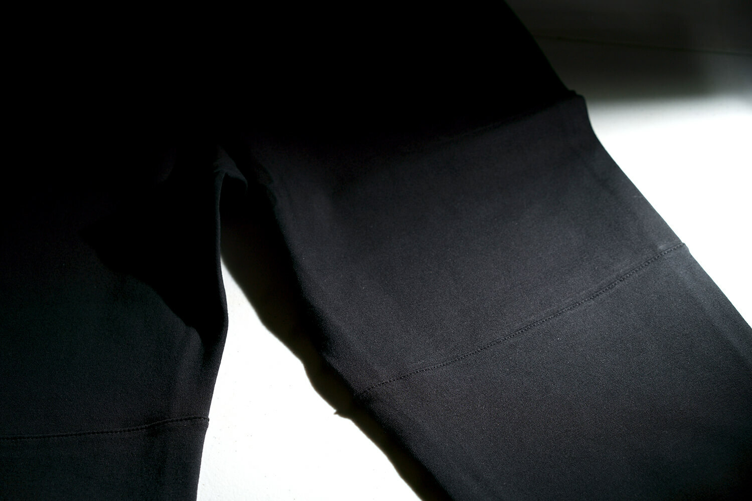 膝蓋後方作了一個立體造型車縫線,是為了讓活動時更不受拘束,這件褲子整體穿起來是窄版的版型,下半身會蠻合的。