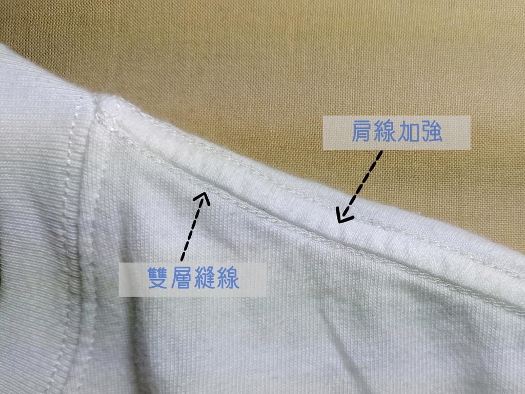 像他們特別在肩線的部分加強裁縫,除了確保不易變形外,也讓穿起來更硬挺好看;縫線也是雙層,讓整件T-Shirt的結構更穩固。