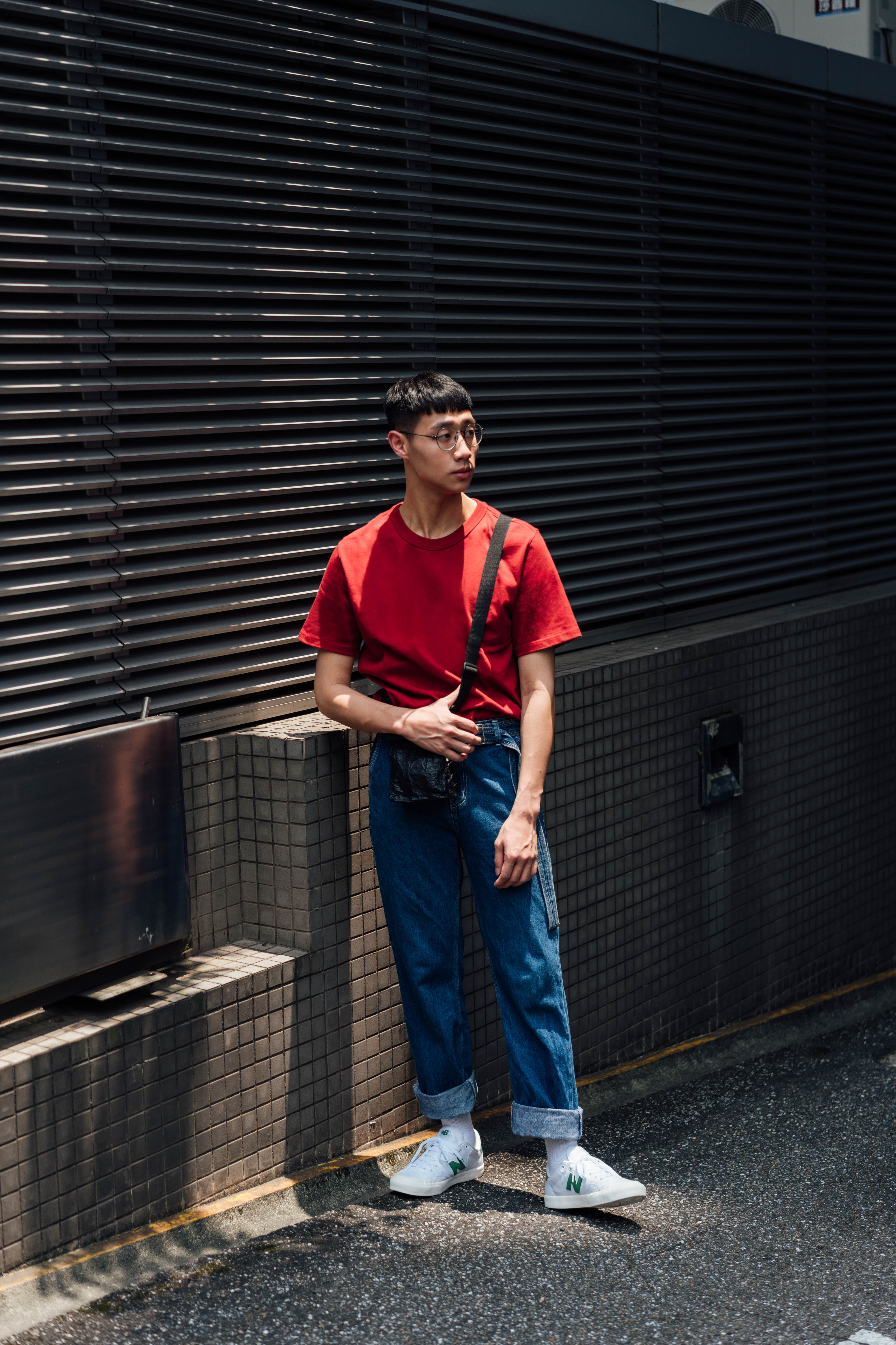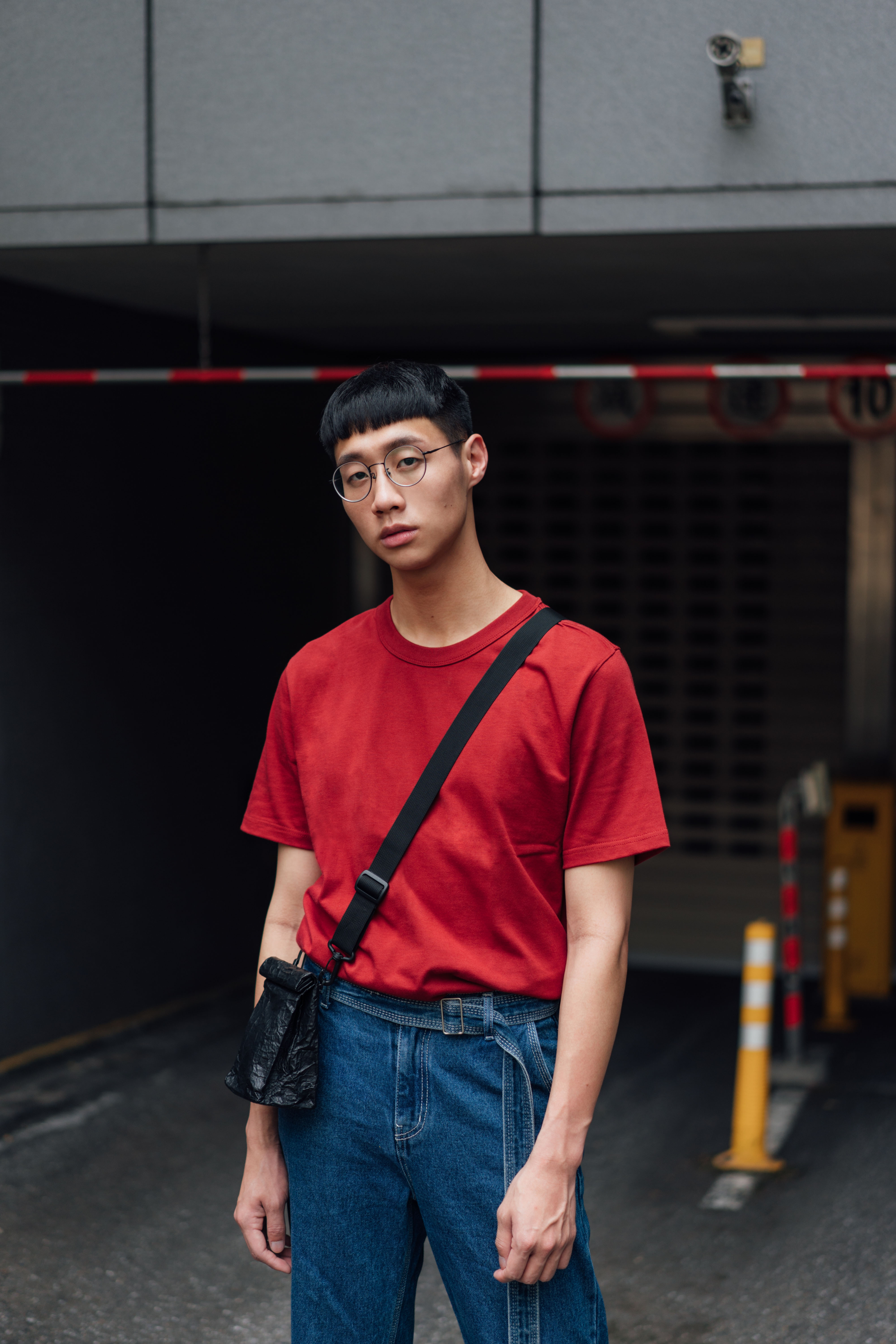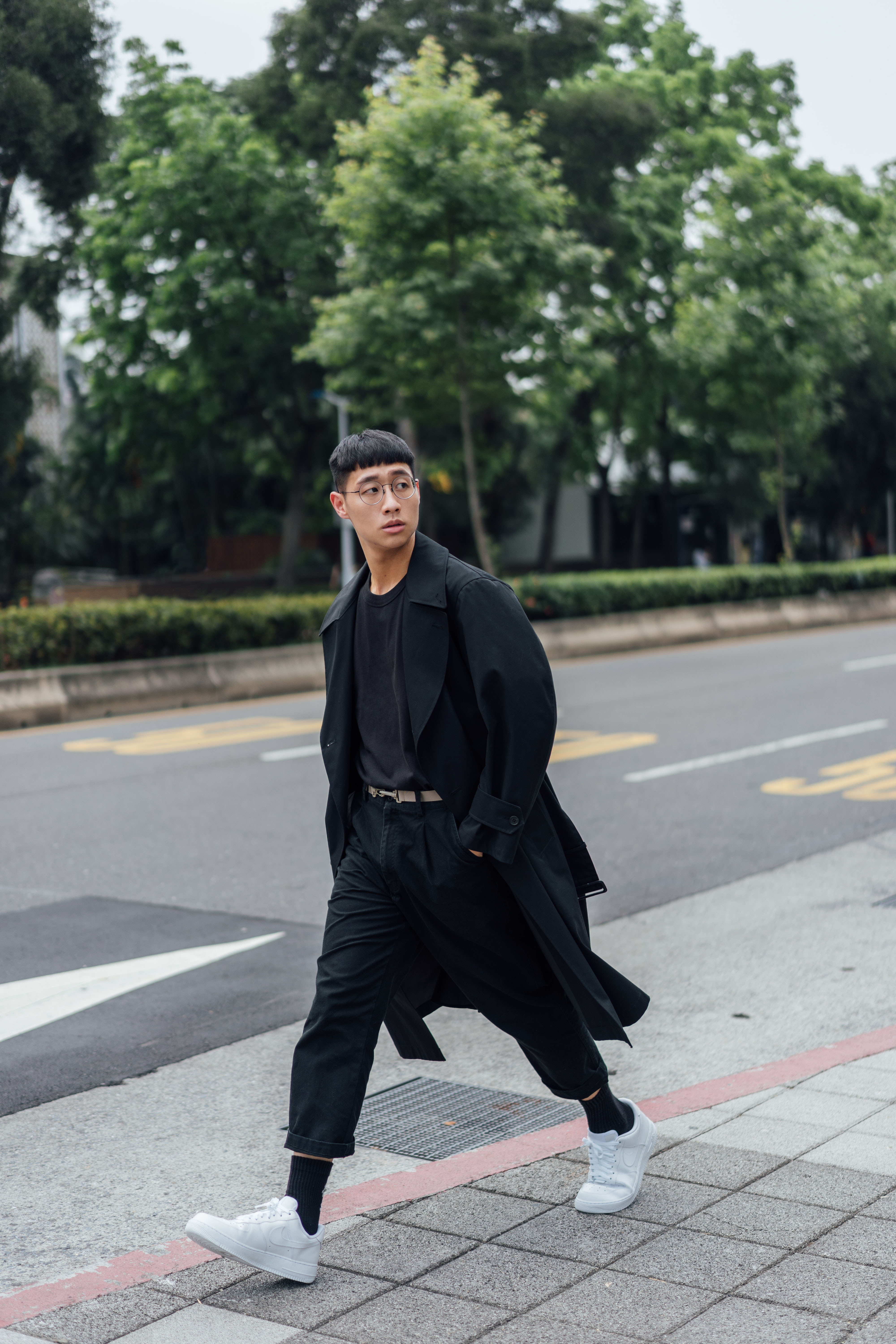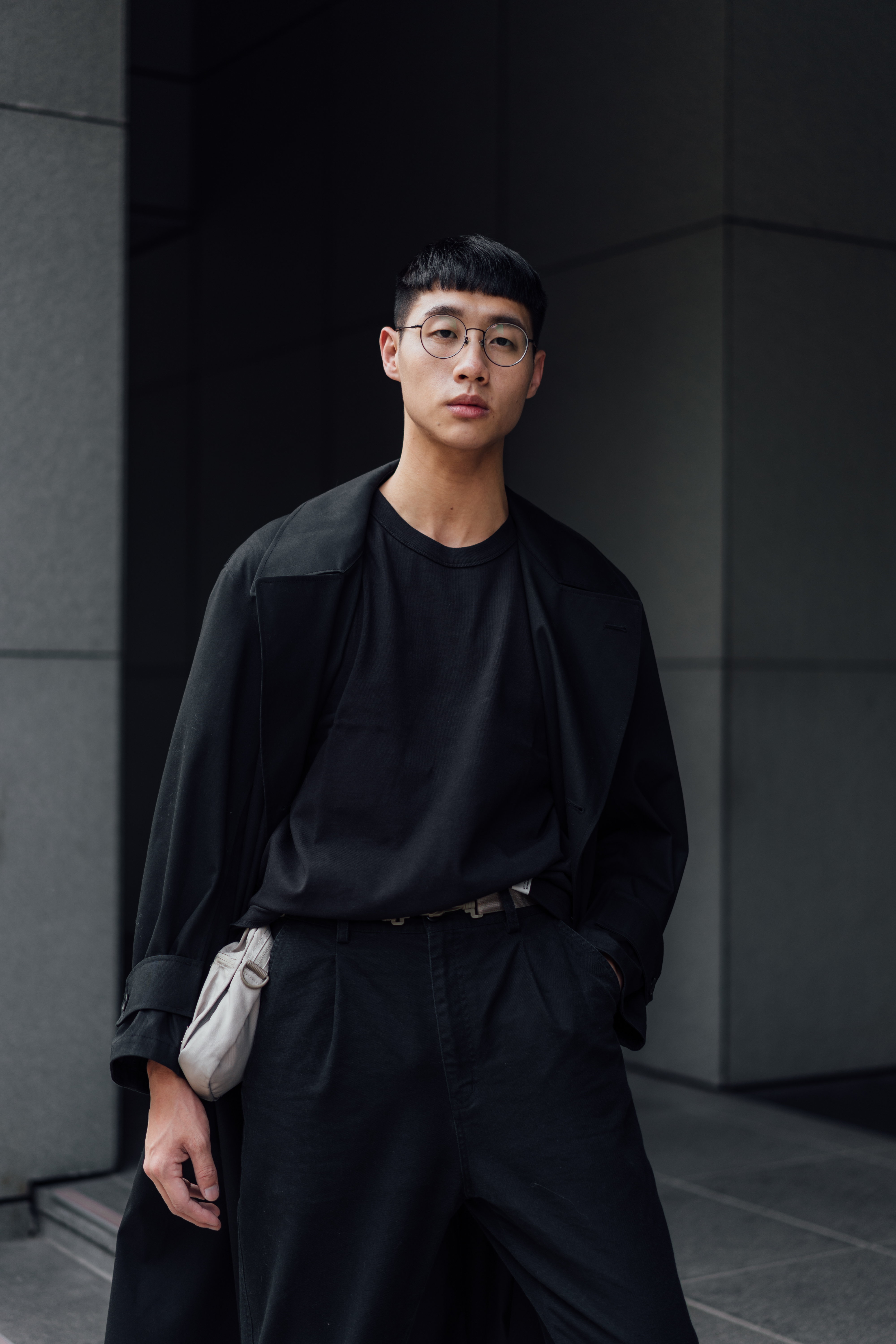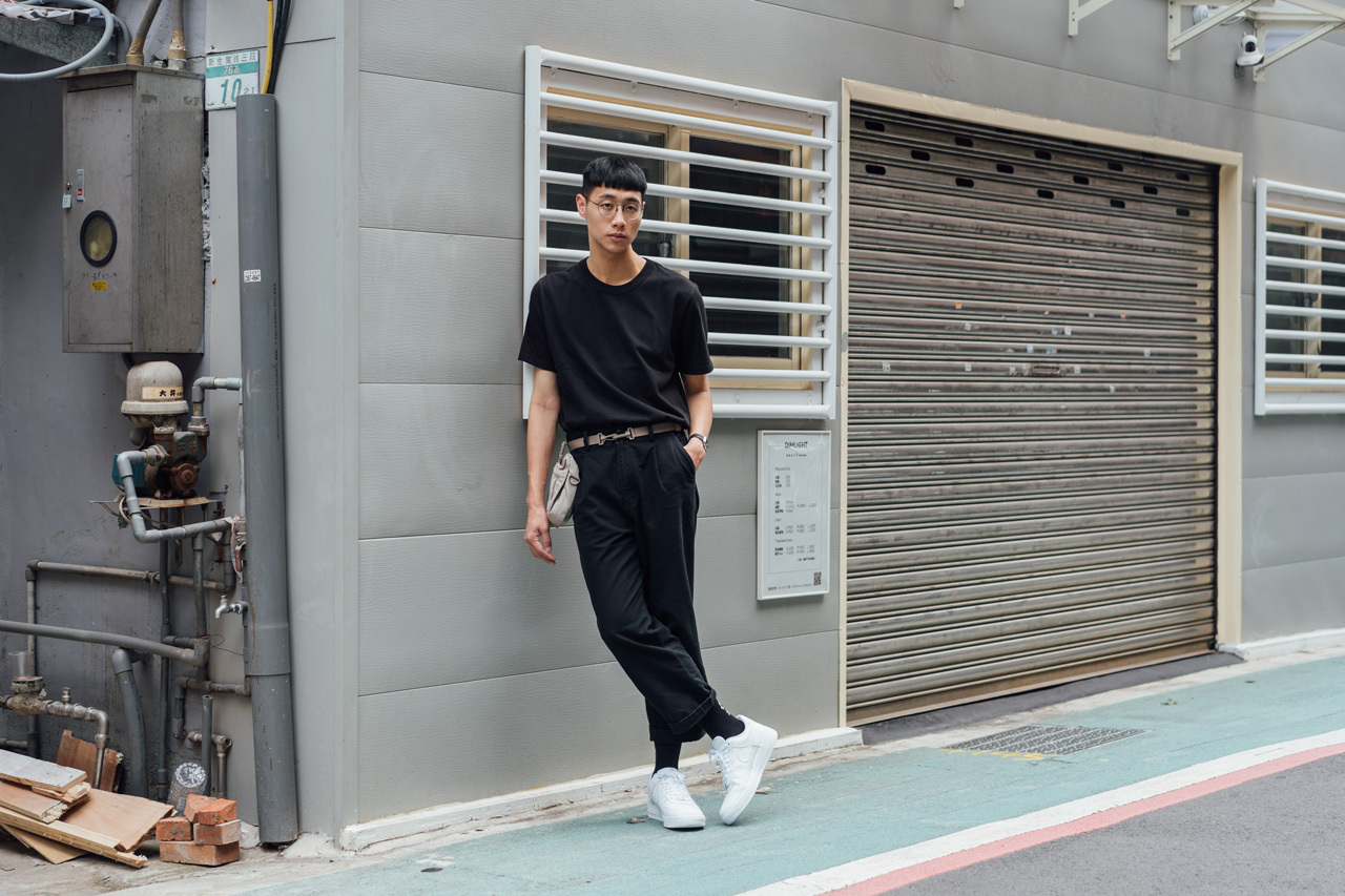 第一種絕對不會出錯的就是「同色系穿搭 」,無論是哪種顏色的素 TEE 都能用這個配色技巧穿出獨特風格。同色系中又以 「All Black 」最常見 ,在整體穿搭 One tone 的基礎上,腰間繫著卡其色腰帶和腰包劃分出線條,讓身材的好比例不會因為全身同色而失焦,同時用配件增加穿搭層次,套上合身的黑色風衣展現都會現代感。