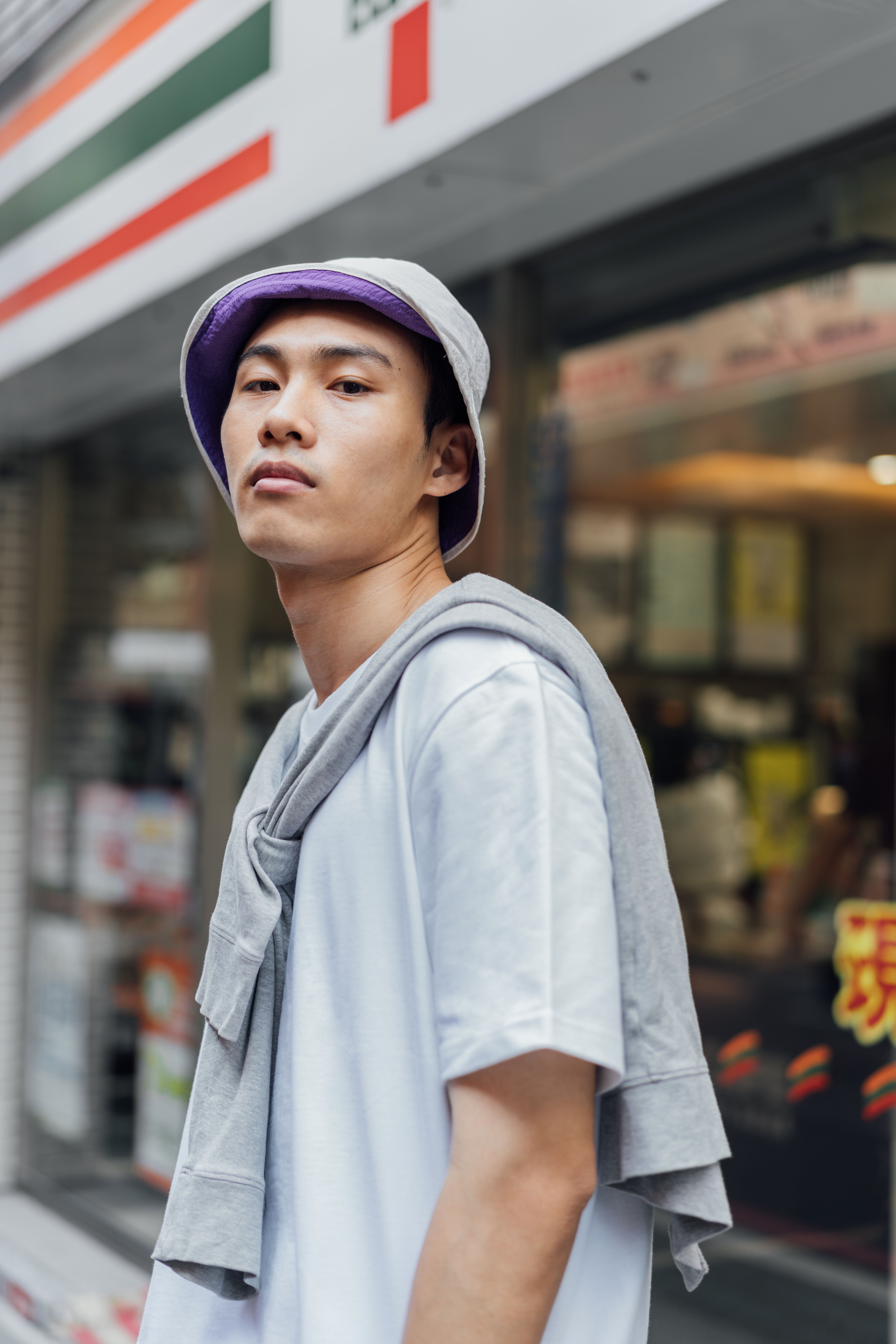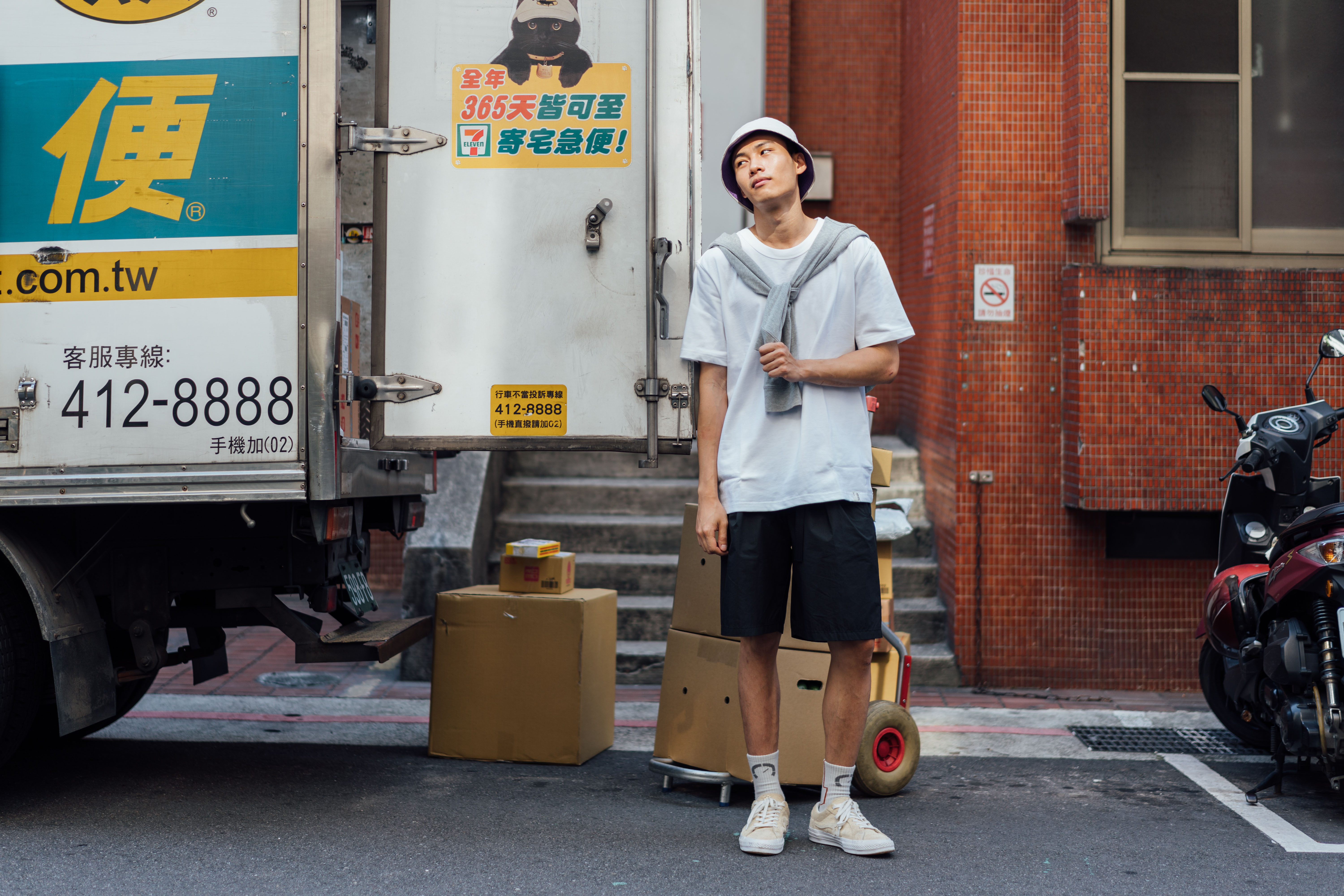 在色彩學上黑、白、灰雖然被稱為「無色彩」,卻是平時最常見的服飾顏色,因為是相似色,黑、白、灰搭配起來比起 One Tone 更加和諧,也給人比較輕鬆的氛圍。尼龍材質的膝上短褲加上織有不規則幾何線圖的白色長襪,不僅拉長腿部,更利用與上身異材質的堆疊增加豐富性,並以灰色針織罩衫提升上身的垂墜感,最後用同色的漁夫帽互相呼應,為整體穿搭營造街頭的率性風格。