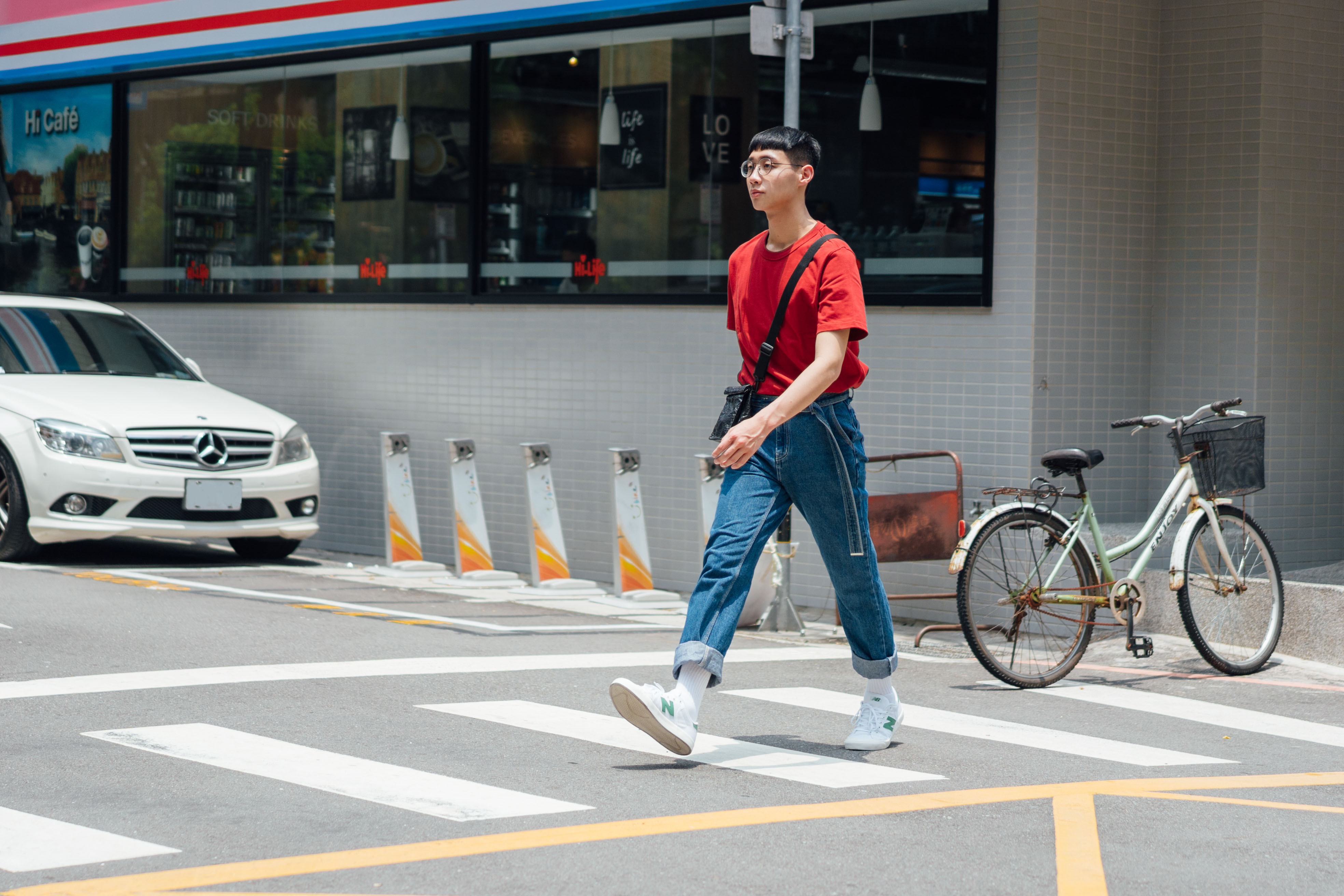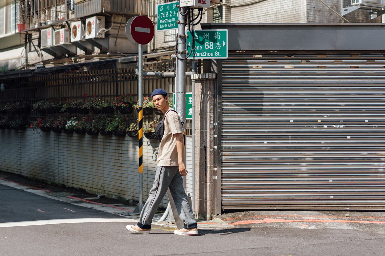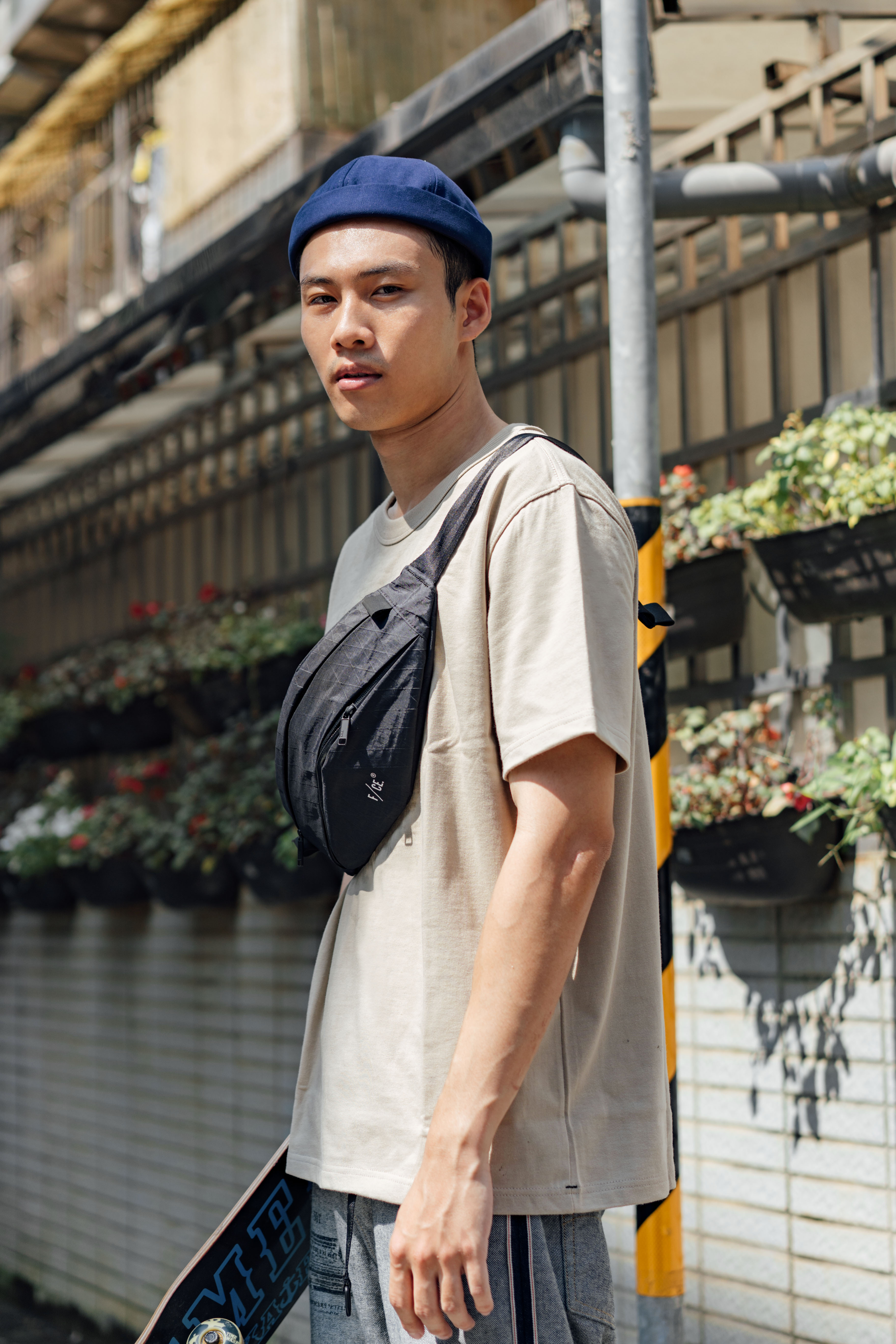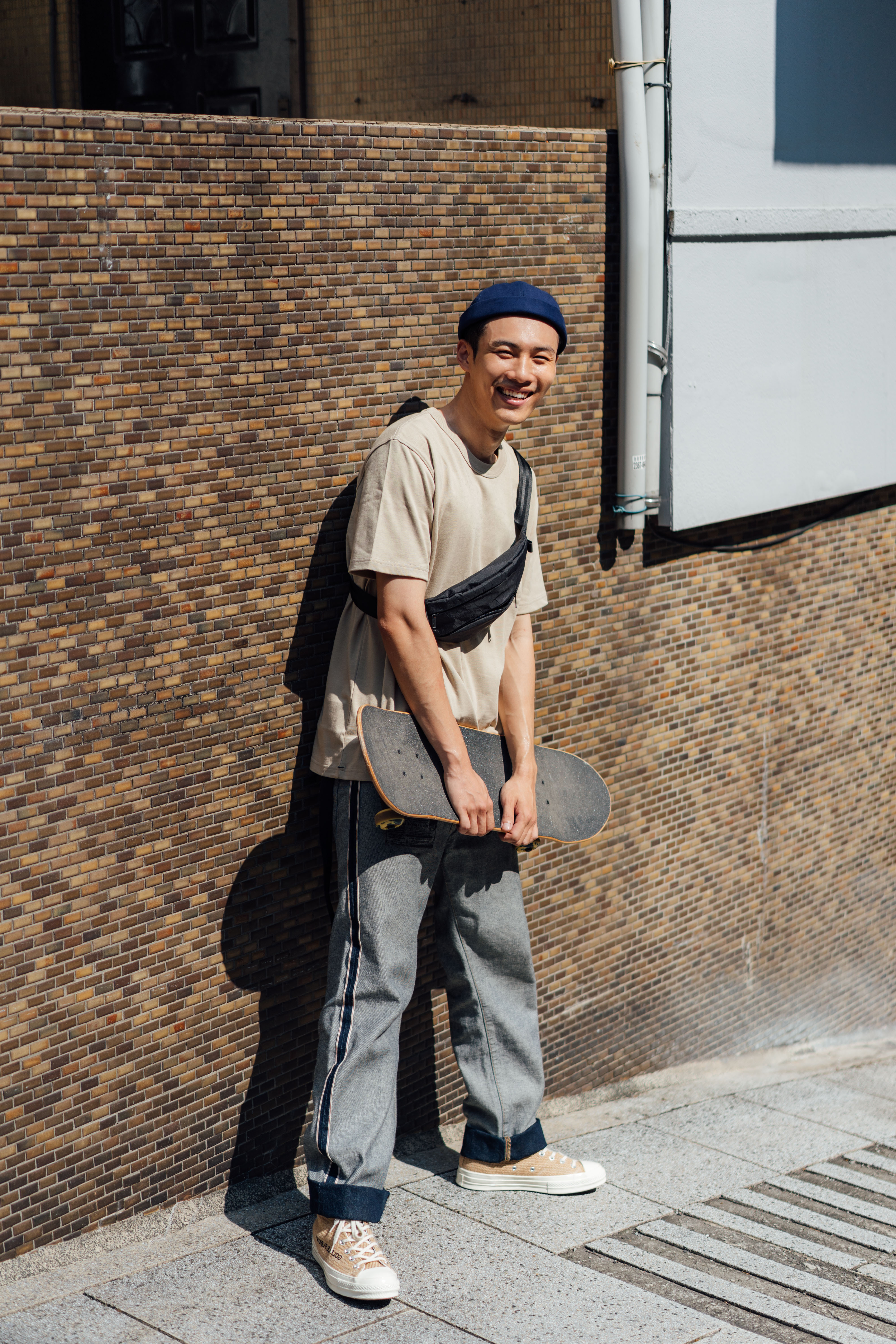 在色相環上相距 180 度的顏色,就稱為「互補色」,因為在色環上差距最遠,所以會給人強烈的視覺感,是相當炫目的配色組合。在衣著搭配上,建議選用彩度低的顏色,例如沙漠黃和刷色過後呈現灰藍色的丹寧褲,在發揮互補色衝撞後的聚焦效果時,也同時降低不和諧的衝突感,再搭配深藍色水兵帽營造街頭感,踩上和素 T 同色的滑板鞋,以不破壞色調的黑色腰包作收,輕便不失有型,踩上滑板就能悠遊自在地盡情穿梭在巷弄間。