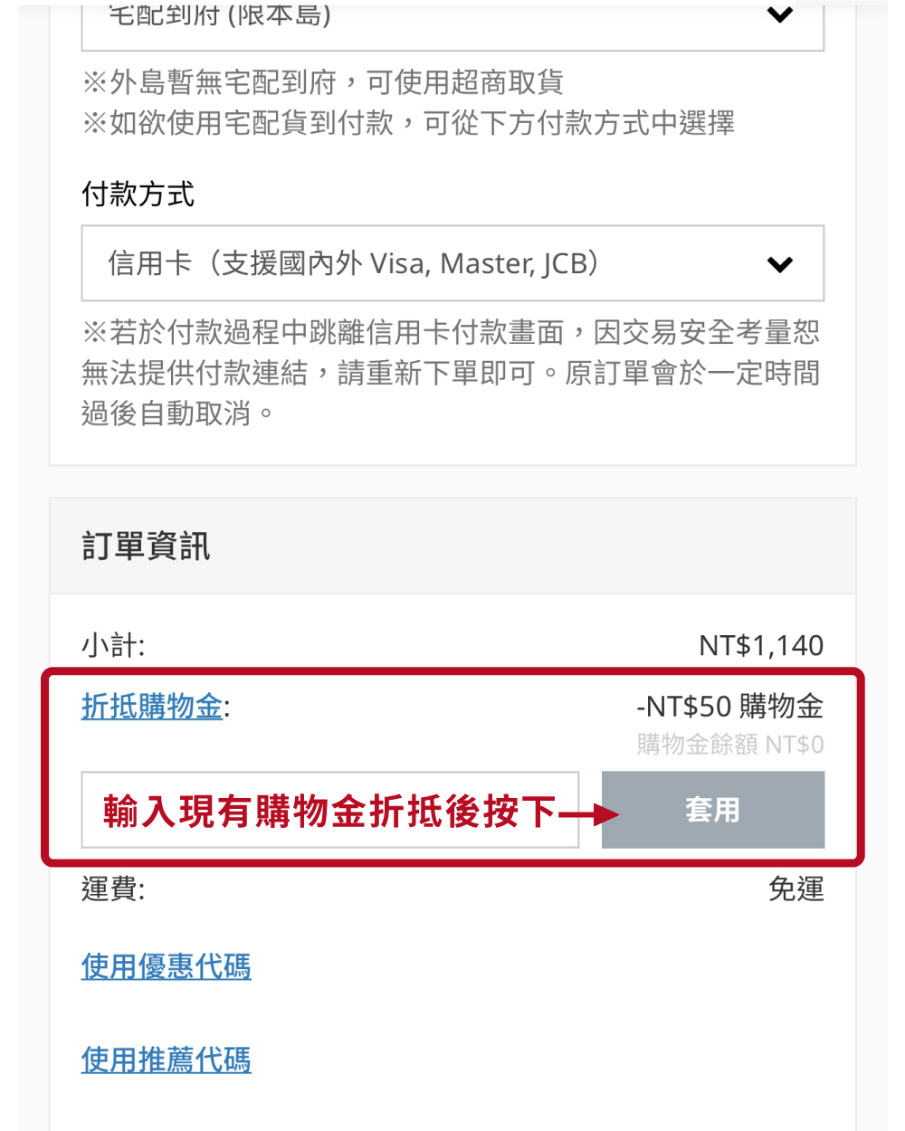 解決方法:請在框框裡輸入現有購物金裡「想折抵的金額」後按下套用即可